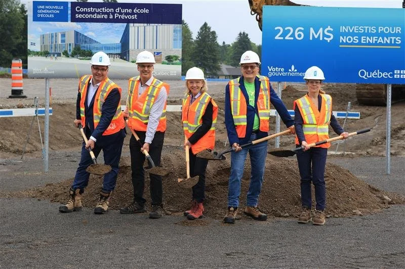 Le 3 juillet dernier, les premières perspectives architecturales de la future école secondaire de Prévost ont été dévoilées et la première pelletée de terre symbolique a eu lieu sur le site de la future école.